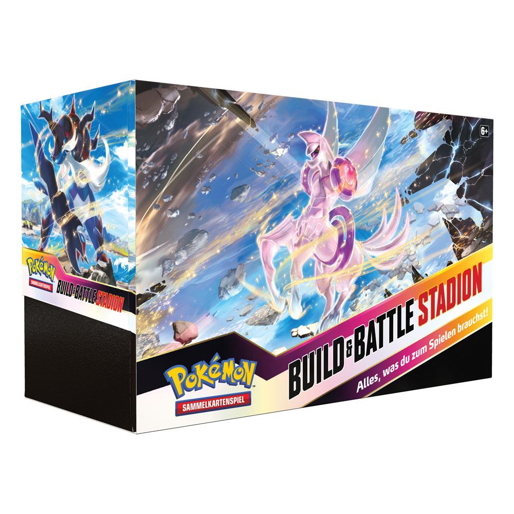 Jedes Build & Battle Stadion der Pokémon-Sammelkartenspiel-Erweiterung Schwert & Schild - Verlorener Ursprung enthält ein umfangreiches Kartenset, einschließlich zwei Build & Battle Boxen, eine für dich und eine für einen Freund. Jede Build & Battle Box enthält vier Boosterpacks und ein Deck mit 40 Karten, das eine exklusive holografische Karte enthält.